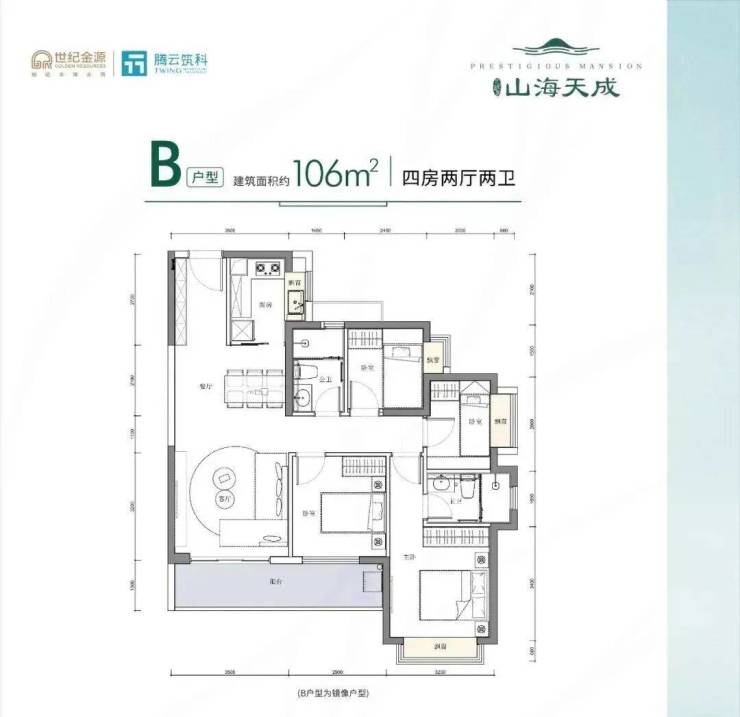 109㎡的4房2厅2卫,设计的是竖厅南北通透格局,客厅3.6米开间,四开间朝南,4个卧室分别是3.2米/2.9米/2.7/2.2米的宽度,全屋飘设计,U型厨房, 得房率:78.39%(不含赠送),客厅连接卧室有1个6.3米长的超大阳台,主朝东南或西南向,看花园景观。