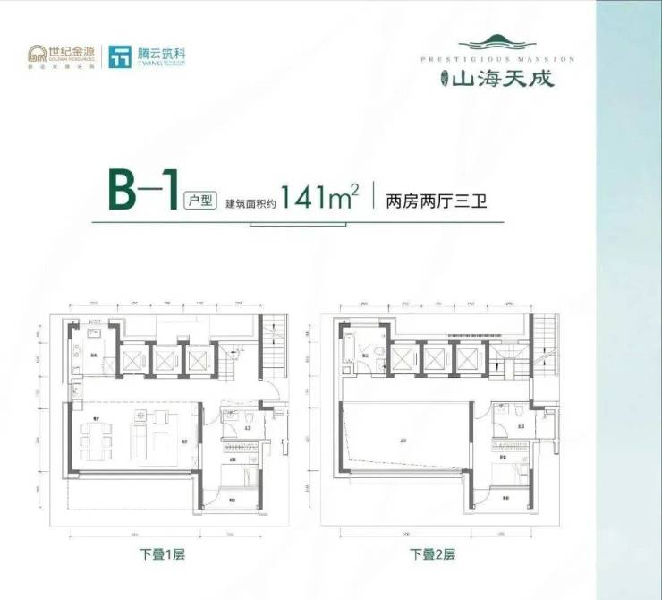 141-151㎡的复式洋房,上下2层,一层2户设计,客餐厅6.95米开间,中空客厅6米挑高,U型厨房,得房率86.17%(不含赠送),空间可塑性比较强。