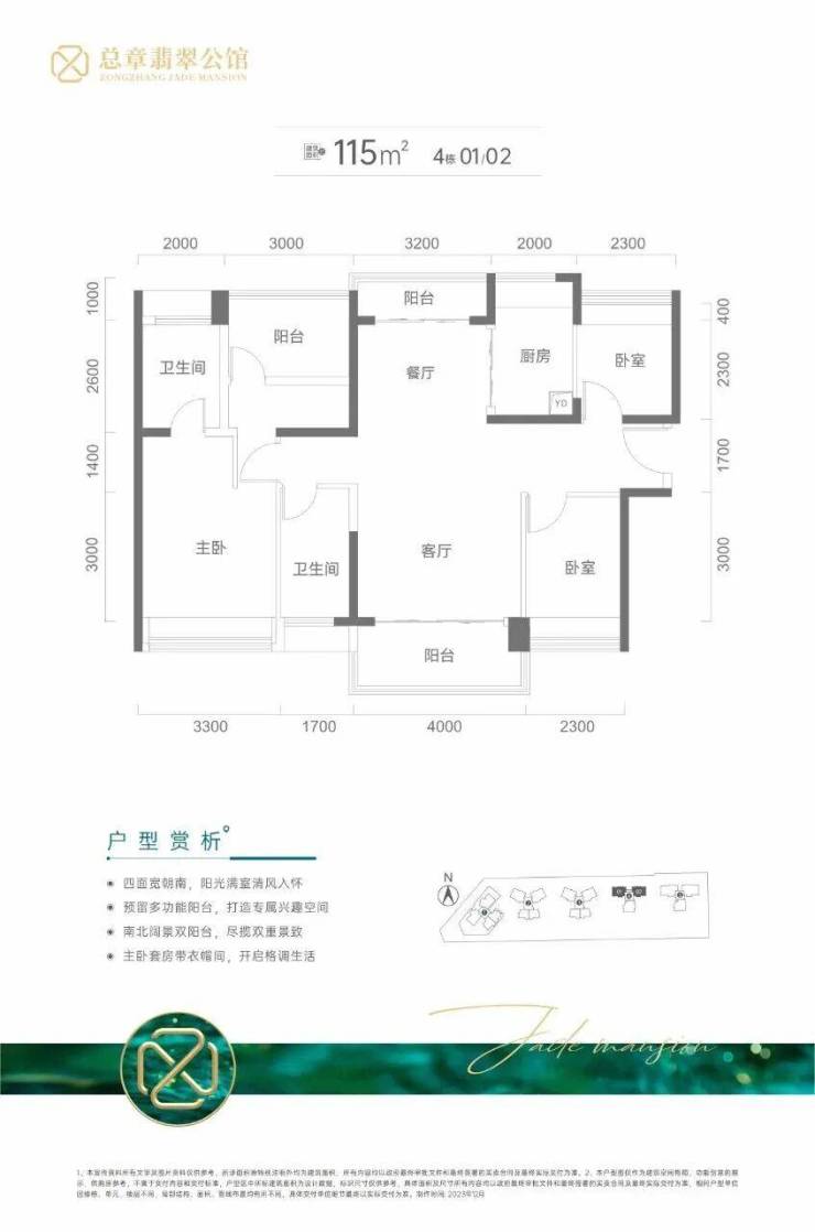 建面115㎡:4房2卫,这种户型有3种朝向,3栋01户型西南/东北通透主阳台朝西南,3栋02户型东南/西北通透主阳台朝东南,4栋01/02户型南/北通透户型阳台朝南;