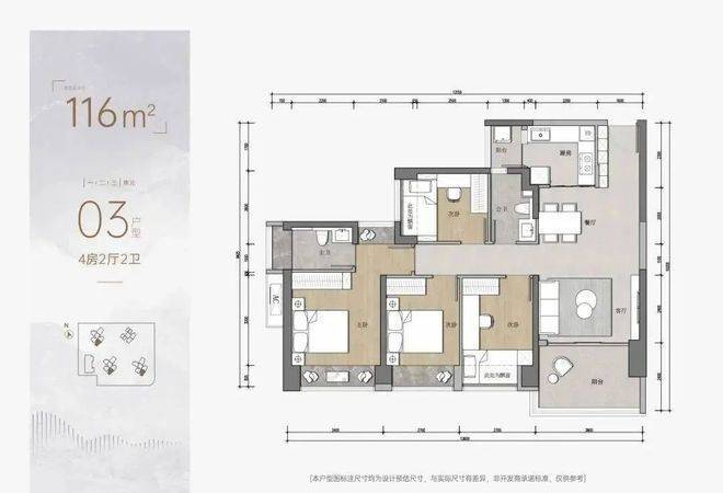 116平在97平原先结构基础上又多加了一个房间,而且客厅开间也是做到了 3.8m 更为阔绰。