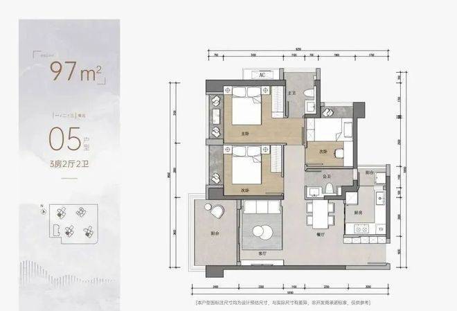 建面约97㎡的户型,产品不论是在功能设计上还是空间利用率上都是极其考究的。三开间朝南;双阳台的设计把每一片空间都高效利用,约3.6米开间,约2.4米进深奢阔景观阳台,让生活每天充满阳光与健康;厨房L型布局,一个转身即可完成洗、切、炒、取;黄金动线、操作流畅;厨房与生活阳台相连,明亮的采光会提升烹饪时的愉悦感。