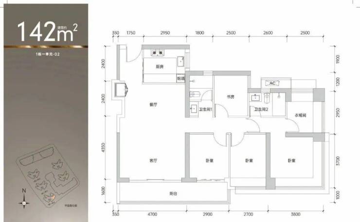 142㎡的4房2厅2卫,1栋1单元02户型,设计的是经典竖厅格局,客厅4.7米开间,四开间朝南,4个卧室分别做到了主卧24.03㎡/次卧9.99㎡/次卧8.99㎡/次卧7.6㎡(包含墙体飘窗),得房率约90%(包含赠送),东南朝向。