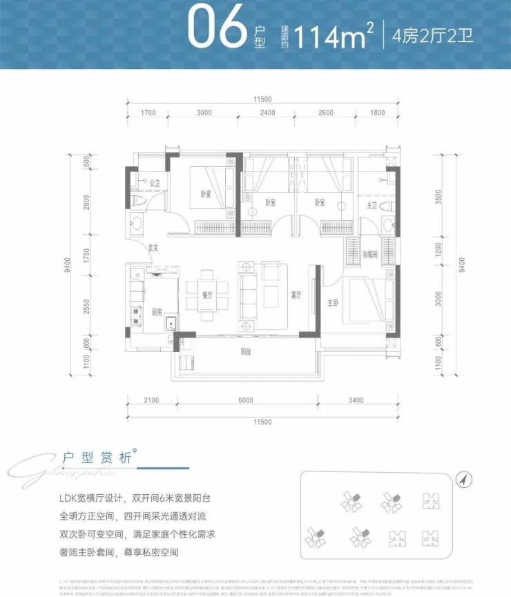 项目4栋商品房户型排布一致,东南和西南朝向,属于比较常见的蝶状塔楼设计,分布了84㎡及98㎡的三房两厅两卫,114㎡及128㎡的四房两厅两卫。