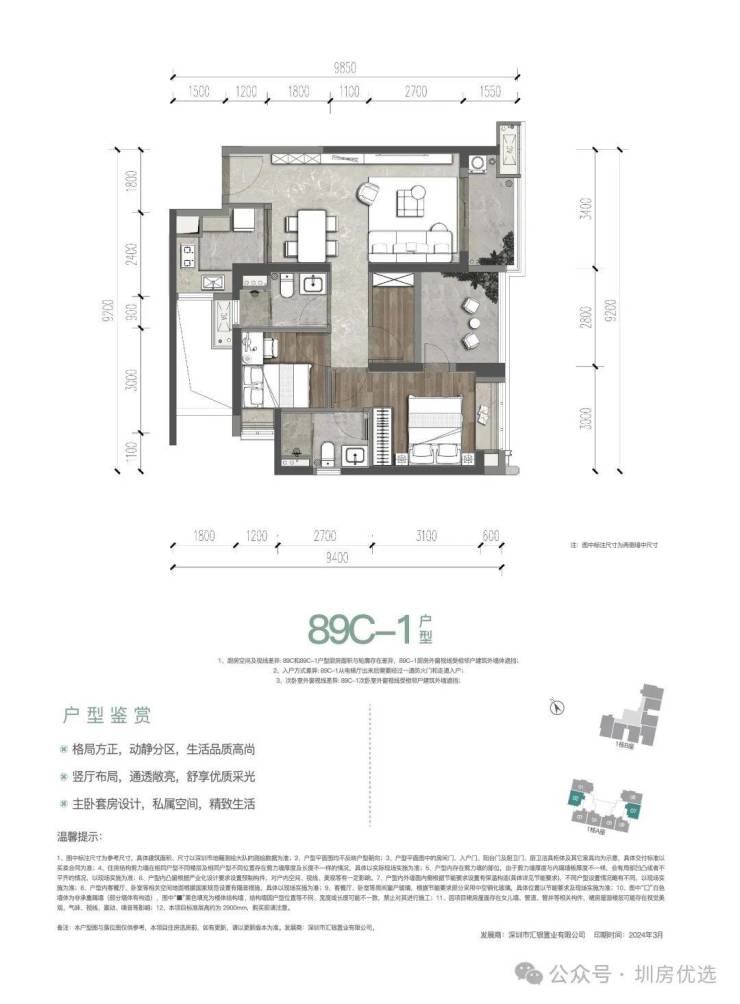 89㎡的3房2厅2卫(二期C-1户型),设计的是经典竖厅格局,得房率:72.97%(不含赠送),阳台约5.26平西北或东南朝向。套内面积64.7㎡+赠送面积8.79㎡=实用面积73.49㎡,加上赠送后得房率约82.87%。