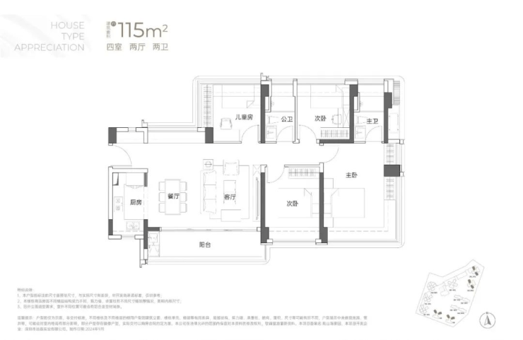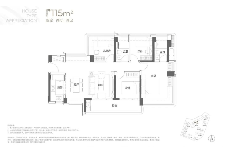 115㎡的4房2厅2卫:横厅南北通透格局,客餐厅6米开间,LDKB一体化,全屋飘窗,4个卧室分别做到了3.9米/3米/2.8米/2.6米的宽度,主卧加1个次卧270°全景飘窗,客厅出6米长的大阳台,L型厨房,得房率约95-97%(包含赠送),西南或东南朝向。115平米户型分布在1栋1单元、1栋2单元、1栋3单元01/02户型,01户型西南朝向都是看小区外围,02户型看向小区;