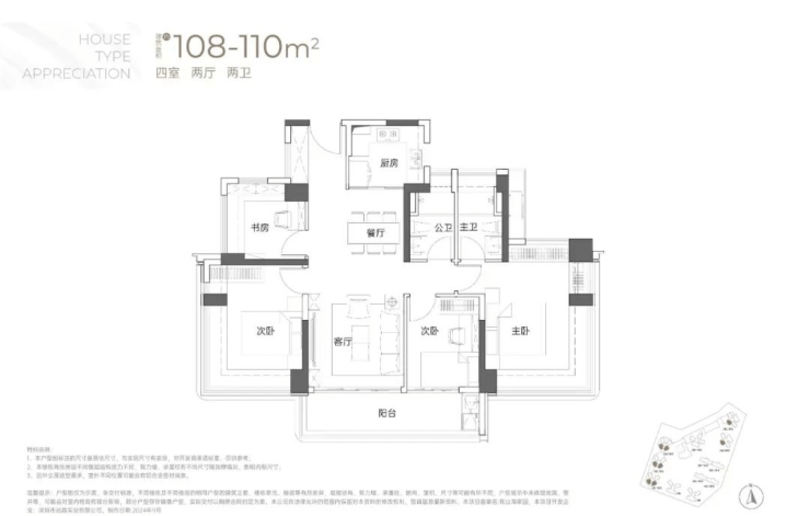 108-110㎡的4房2厅2卫:竖厅双龙抱珠格局,客厅开间3.5米,LDKB一体化,4个卧室分别做到了3.7米/3.4米/2.8米/2.6米的宽度,主卧加2个次卧270°全景飘窗,客厅连接次卧出6.1米长的大阳台,U型厨房,得房率约95-97%(包含赠送),西南或东南朝向。户型分布在1栋1/2/3单元03/04户型,03户型东南朝向,04户型西南朝向;只有2栋2/3单元看小区,其他都看向小区外部;