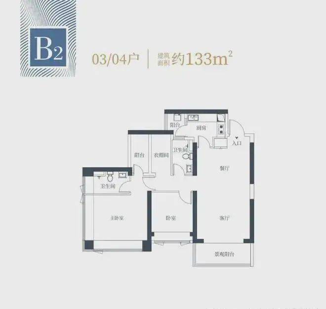 1栋二单元B2户型:面积约为133㎡