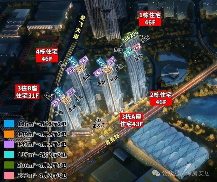 龙岗大运,中海大运玖章花园在2025年12月17日取证入市,本次加推1栋跟3栋B座,面积有127-143㎡的4房2厅2卫,139m²的3+1房2厅2卫,206㎡的4房2厅3卫户型,都是设计的大平层格局,共197套房源,备案均价6.22万/m²,备案单价5.17-7.24万/m²,总价667-1492万/套,其中有2套面积342平的顶复,总价2529-2798万/套,合同约定在2027年12月带高品质精装交房。