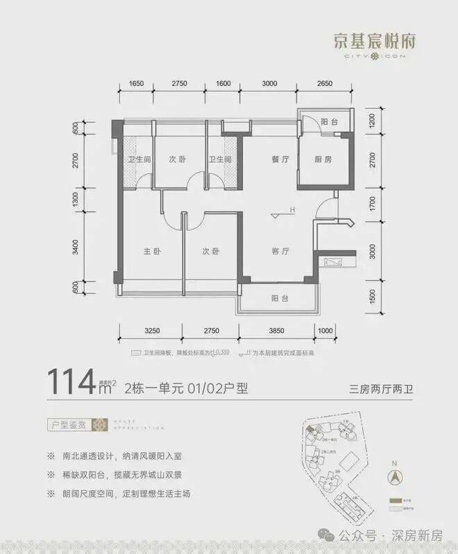 京基宸悦府,地址位于深圳福田区,整个项目规划总建面约22万㎡,首推157套房源,住宅户型面积85-110-114-130-140㎡两房至四房,其中85㎡的两房8套,110-114㎡的三房141套,130㎡的四房5套,140㎡的四4房3套。是福田中轴之上为数不多的重点项目,京基宸悦府交房时间:2026年6月31号。
