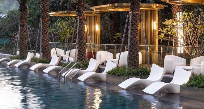 园区结合现代东南亚设计风格,将生态都会雨林湾融入到园林中,双桥(雨林桥、雨水桥)规划,碧水湾溪约2000m²泳池设计,棕榈迎宾,于繁华里享静谧生活。