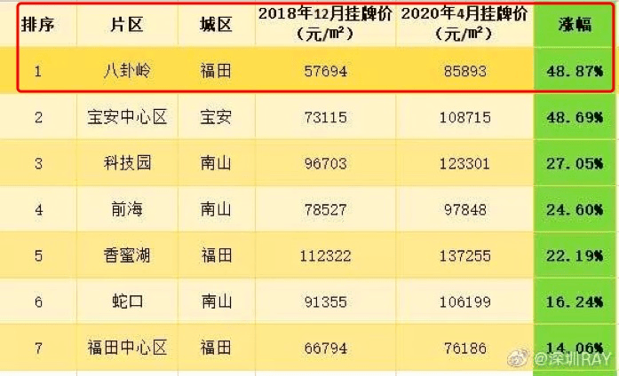 先来看组数据,2018年12月到2020年4月,八卦岭挂牌价涨幅直接以48.87%位居第一,赶超科技园、前海、香蜜湖,谁能想到,深圳各片区挂盘价涨幅最大的区域竟是八卦岭。