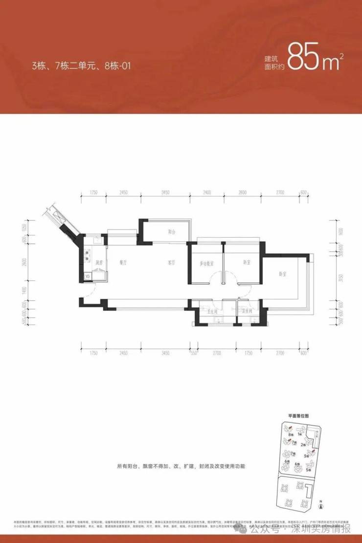 ①户型分析:小面积、低总价,最佳上车首选户型;全南向排布户型,多飘窗的设计,采光通风不错;户型方正,动静分区的设计注重隐私性;明厨明卫,三分离洗手间设计;②朝向:西南、东南向③视野:小区外围,临万丰路,看城市风景,施工建设区域【约85㎡三房两卫】户型分布:分布在7栋2单元、8栋、3栋,共710套,①户型分析:有横厅和竖厅两种户型,全屋7个飘窗、13米采光面,非常通透;预留超多收纳空间主卧双面采光,景观视野更开阔②朝向:东北、西北朝向③视野:社区花园和社区楼栋