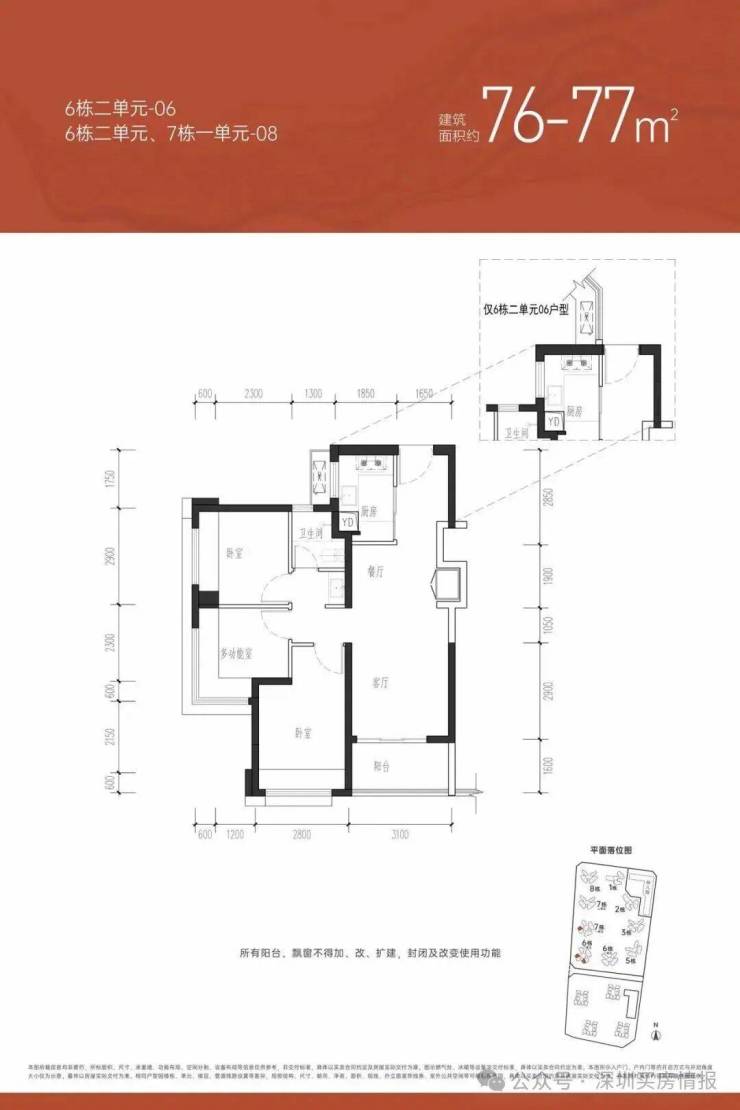 【约76㎡三房一卫】户型分布:只分布在6栋2单元和7栋1单元,共258套