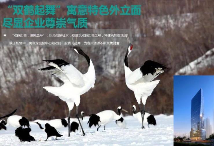 “双鹤起舞”寓意外立面,三层夹胶半钢化中空双银LOW-E玻璃幕墙,舒适节能兼备;