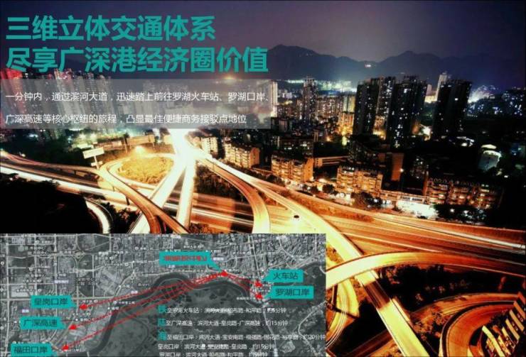 一分钟内,通过滨河大道,迅速踏上前往罗湖火车站、罗湖口岸、广深高速等核心枢纽的旅程,凸显最佳便捷商务接驳点地位。