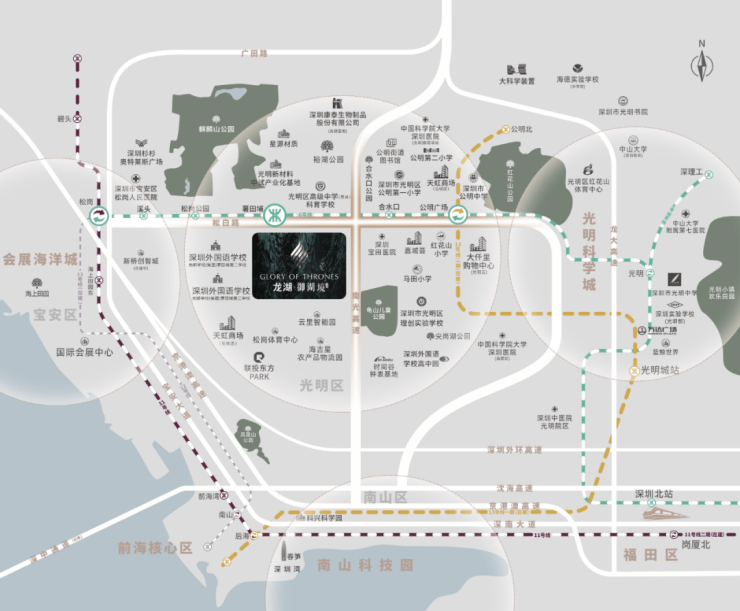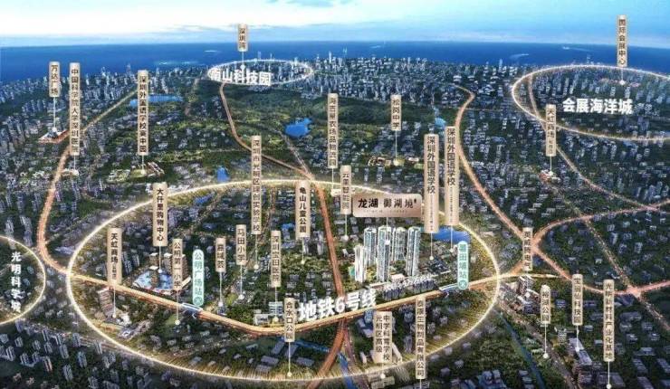 龙湖御湖境,位于光明区马田街道公明西环大道与健兴路交汇处西北侧,项目西北侧是去年入市的金地明峰府,西侧规划1所九年制60班公办学校,东南侧是署田埔龟山花园,南侧是科技园区,东侧当前是大片的城中村,6号地铁线“署田埔站”距离约300米。
