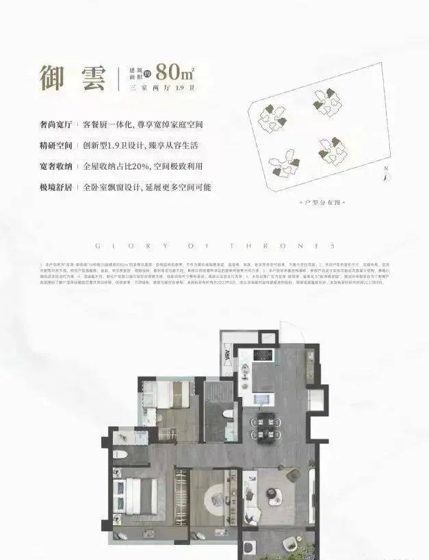 80㎡的3房2厅1.9卫,设计的是竖厅格局,客厅开间3.4米,LDKB一体化,S墙设计预留冰箱位,U型半开放式厨房,创新式1.9卫设计,得房率:78.99%(不含赠送),有西北、西南、东北、东南4个朝向。