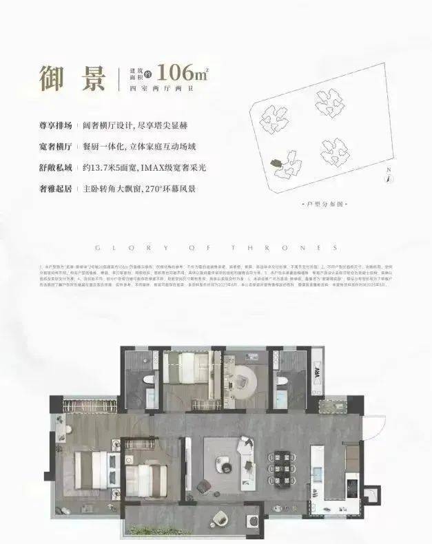 106㎡的4房2厅2卫,设计的是横厅南北通透格局,客餐厅开间5.6米,餐厨一体化,约13.7米超幕视野,超长阳台,主卧转角270°大飘窗,只有2栋07户型才有,得房率:78.99%(不含赠送),阳台主朝西南向。