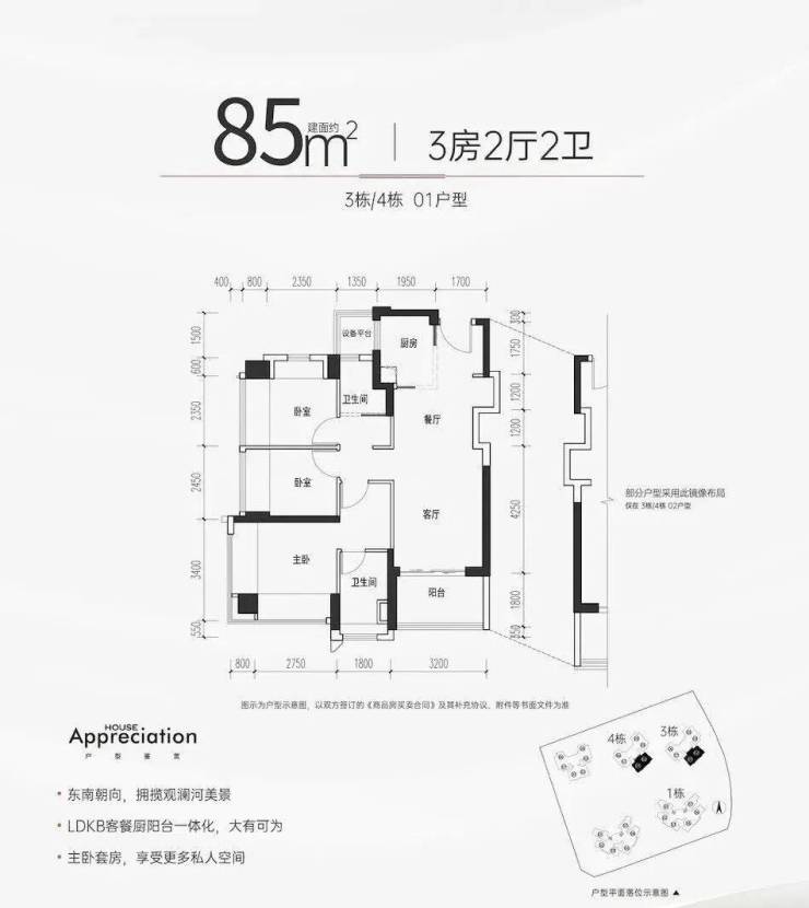 82㎡的3房2厅2卫,03户型,设计的是竖厅格局,进门独立玄关,LDKB一体化,S墙设计预留冰箱卡槽位,主卧双飘窗设计,L型厨房,卫生间干湿分离,得房率约100%(包含赠送),西南朝向。
