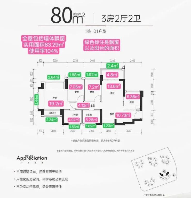 项目主推建面约72-105㎡的3-4房,产品基本在98%使用率,最高实用率甚至能突破100%,相较于新规前普遍75%左右的得房率,堪称是“王炸”级别的存在!