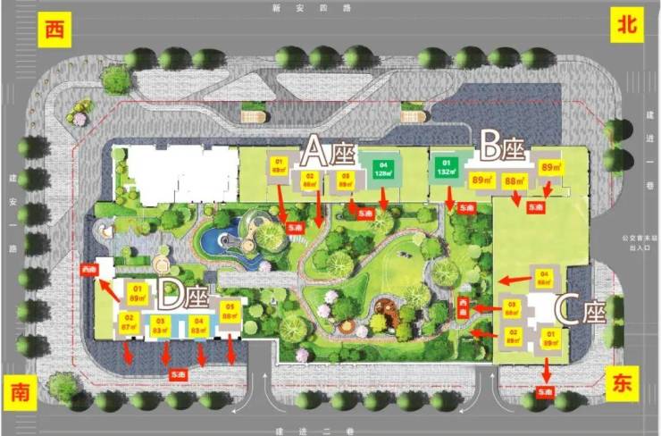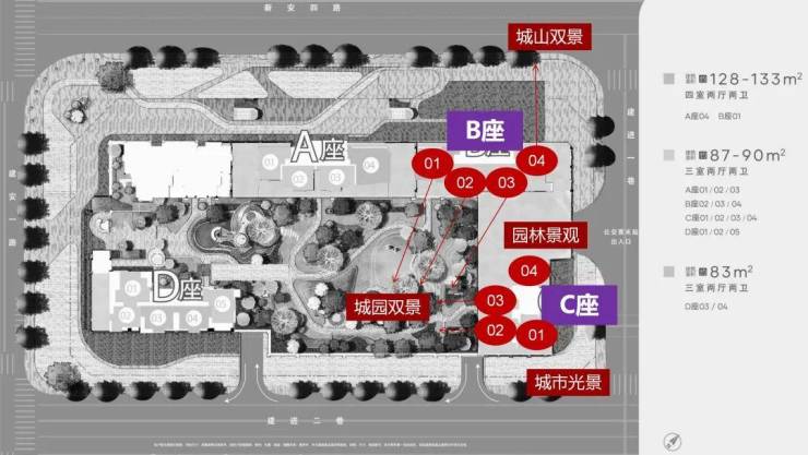 面积:89㎡3房1卫。89㎡3房2卫,128-133㎡4房2卫,
