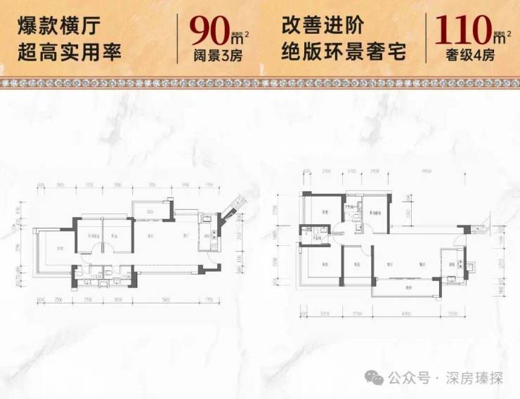 110㎡的4房2厅2卫,设计的是横厅南北通透格局,客餐厅6.1米开间,LDKB一体化设计,五开间朝南,动静分区,分别做到了主卧14.3㎡/次卧10.01㎡/次卧9.58㎡/次卧8.16㎡(包含墙体飘窗),L型厨房,公卫三段式干湿分离,得房率78.3%(不含赠送),西南朝向。套内面积86.46㎡+赠送面积19.9㎡=实得面积106.36㎡,加上赠送后得房率96.29%。
