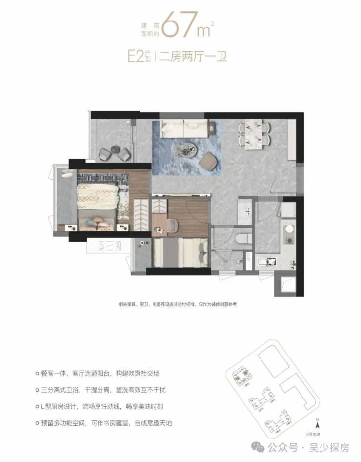 67㎡的2房2厅1卫(E2),设计的是竖厅格局,餐客一体,L型厨房,卫生间三段式分离设计,阳台预留多功能空间可以改小书房,西南或东北朝向。