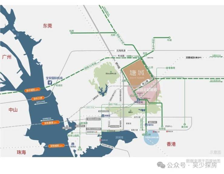 项目还依托深圳北站与宝安国际机场,实现深港、深广半小时生活圈,共融大湾区1小时生活圈。