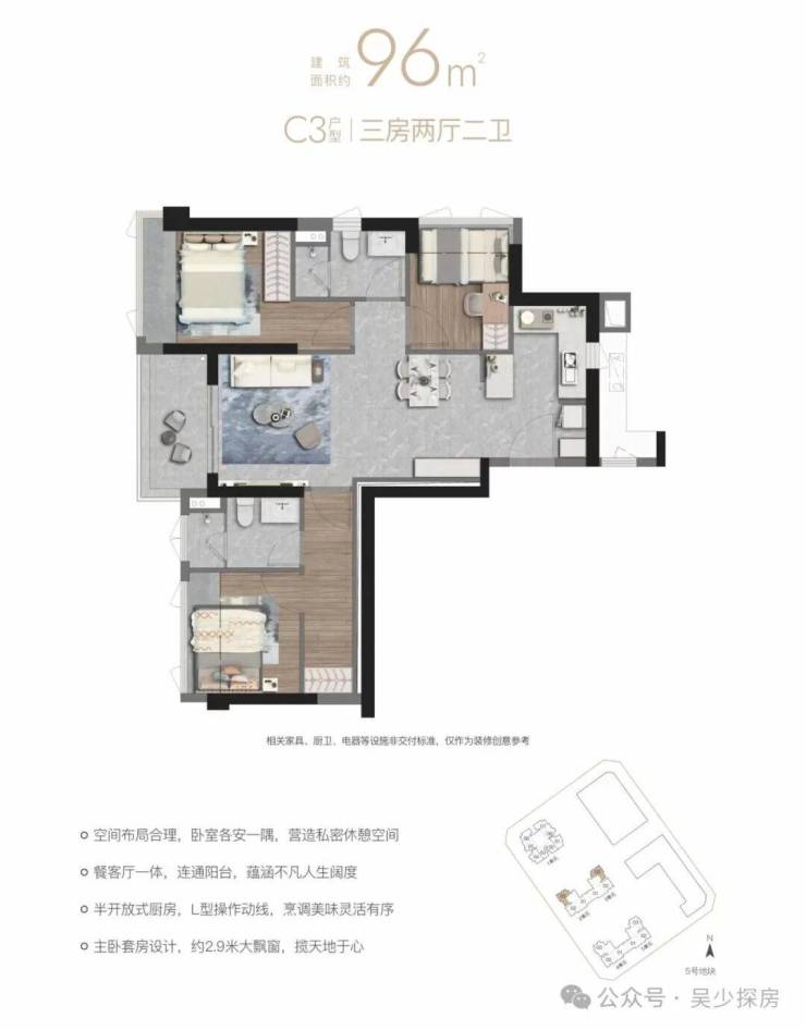 96㎡的3房2厅2卫(C2),设计的是竖厅经典格局,餐客厅一体化,三开间朝南,主卧套房设计,U型厨房,公卫三段式分离设计,阳台东南朝向。