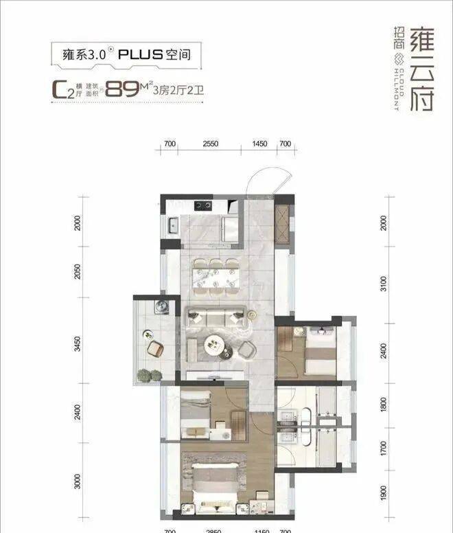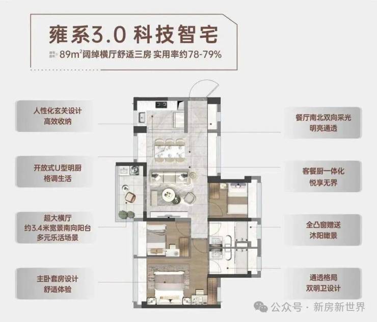 89㎡的3房2厅2卫(C1户型),设计的是经典竖厅格局,客餐厅一体化,客厅3.45米开间,S墙设计预留冰箱位,3个卧室分别是3.1/2.3/2.3米的宽度,L型厨房,公卫三段式分离设计,西南或东南朝向。