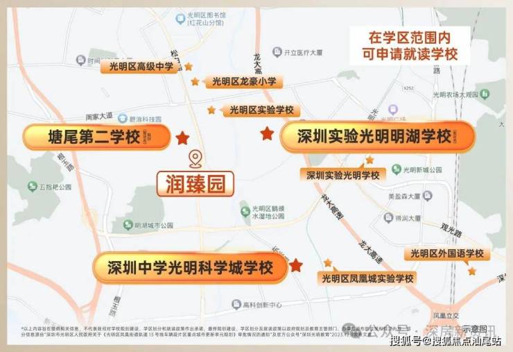 项目自带有1所9班制幼儿园,家门口约100米有1所九年制公办学校在建,另外根据光明区教育局2024年最新的学区划分,润臻园属于塘尾社区,小学学区划分在光明区外国语学校、凤凰城实验学校、光明区实验学校、玉塘学校、龙豪小学;初中学区划分在深圳中学光明科学城学校二部、光明高级中学、深圳实验光明学校。