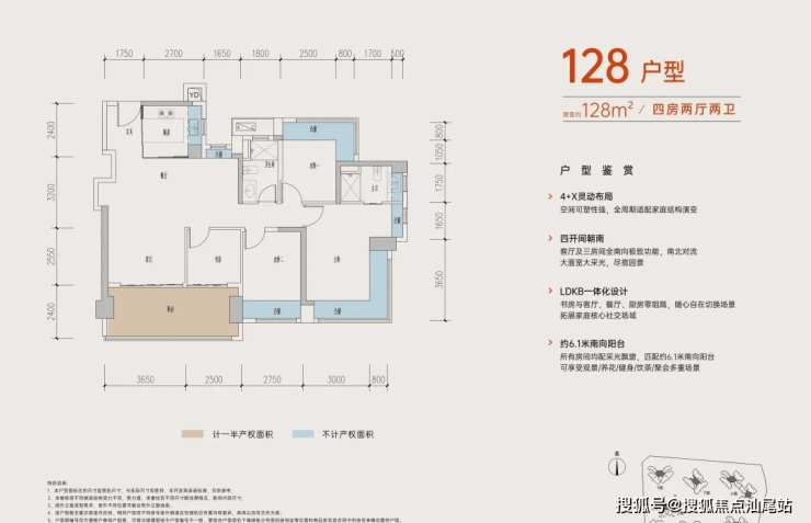 128㎡的4房2厅2卫,设计的是经典竖厅格局,进门入户玄关,客厅3.65米开间,四开间朝南,动静分区,主卧+1个次卧270度大飘窗,客厅连接次卧出6.15米长大阳台,4个卧室分别做到了主卧20.14㎡/次卧11.28㎡/次卧10.58㎡/次卧6.37㎡(包含墙体飘窗),得房率约:77.39%(不含赠送),东南朝向。赠送面积21.54㎡,加上赠送得房率94.45%。