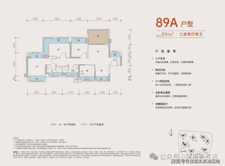 89㎡的3+1房2厅2卫,A户型,设计的是竖厅南北通透格局,进门入户玄关,客厅3.5米开间,,五开间朝南,主卧南北通透双飘窗,3个卧室分别做到了主卧15.73㎡/次卧14.08㎡/次卧8.96㎡(包含墙体飘窗),得房率约:77.39%(不含赠送),阳台主朝东北向,这次推出最靓的户型可以改4房,赠送面积24.5㎡,加上赠送得房率高达104.87%。