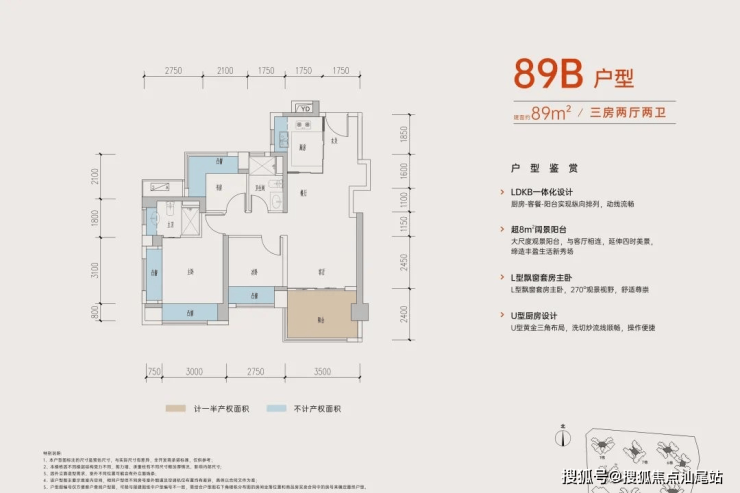 89㎡的3房2厅2卫,B户型,设计的是经典竖厅格局,进门入户玄关,客厅3.5米开间,三开间朝南,,主卧+1个次卧270°飘窗,3个卧室分别做到了主卧15.1㎡/次卧8.52㎡/次卧7.77㎡(包含墙体飘窗),得房率约:77.39%(不含赠送),西南朝向。赠送面积16.96㎡,加上赠送得房率96.84%。