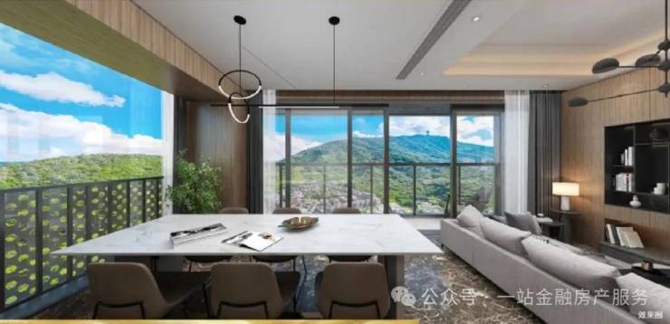 通过四栋高低错落的建筑天际线与高低起伏的梧桐山脊相呼应,让空间与山景结合,自然入室;青山远黛园景,窗窗见景。