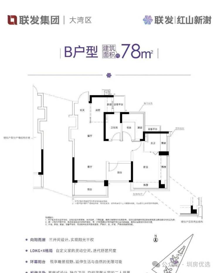 约78㎡的2+1房2厅2卫,设计的是竖厅LDKG+X格局,S墙设计预留冰箱卡槽位,做到了主卧双飘窗,三开间朝南,动静分区,U型大厨房,厨房烟道还做了外置空间,可以更好的利用厨房空间,卫生间三段式干湿分离。赠送了双阳台一半面积+6面飘窗+双设备平台,超100%得房率,东南或西南朝向。这是整个红山板块唯一一个80平以下做到了3房2卫的户型。