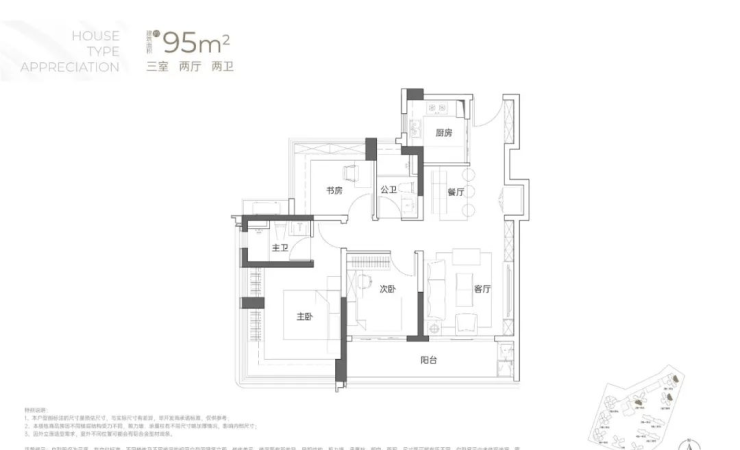 95㎡的3房2厅2卫:传统竖厅格局,客厅开间3.5米,LDKB一体化,S墙设计预留冰箱卡槽位,3个卧室分别做到了3.6米/2.8米/2.8米的宽度,主卧加1个次卧270°全景飘窗,客厅连接次卧出6.3米长的大阳台,U型厨房,得房率约95-97%(包含赠送),西南或东北朝向。户型分布在2栋2/3单元04/05户型,东北朝向看大南山、2栋1单元04/05户型西南朝向看小区;