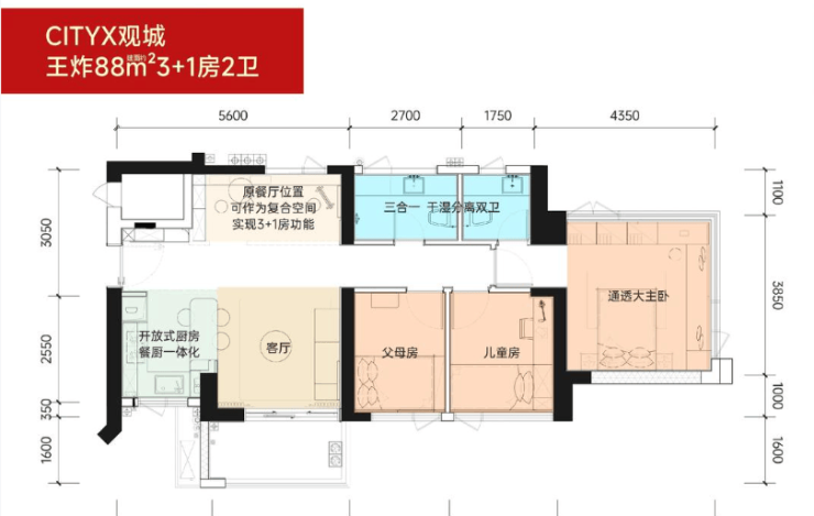 88-143㎡3-5 房,得房率约 88%-90%,格局方正、飘窗可拓展,刚需三房不局促、改善四房够舒适,精装交付省心入住。