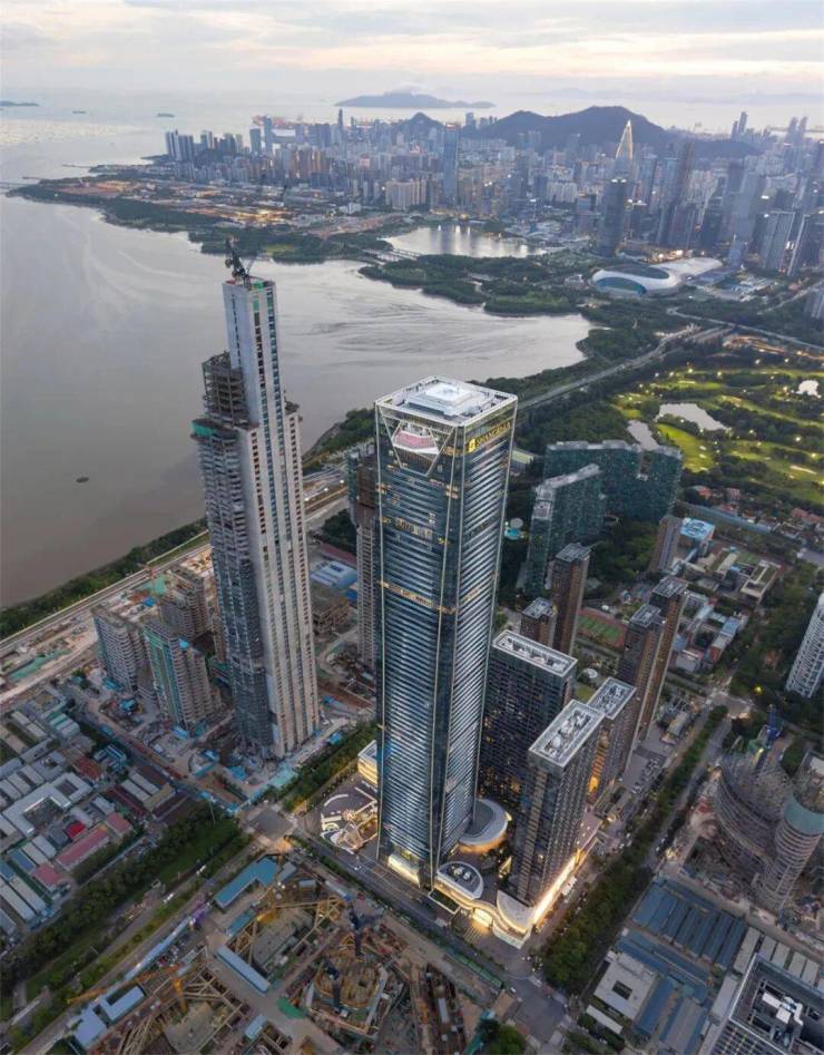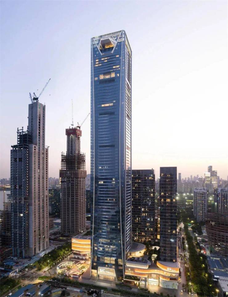 SIC 超级总部中心立于深圳湾超级总部基地的超级城市底盘之上,是片区的首发之作,也是深超总基地内业态复合度最高的综合体项目,总体量达到60 万平方米,包括358 米超甲级写字楼、深圳最高的香格里拉酒店、高端圈层社交平台“SIC65 商务会所”、深圳首个科技赋能的购物中心以及高端公寓等。