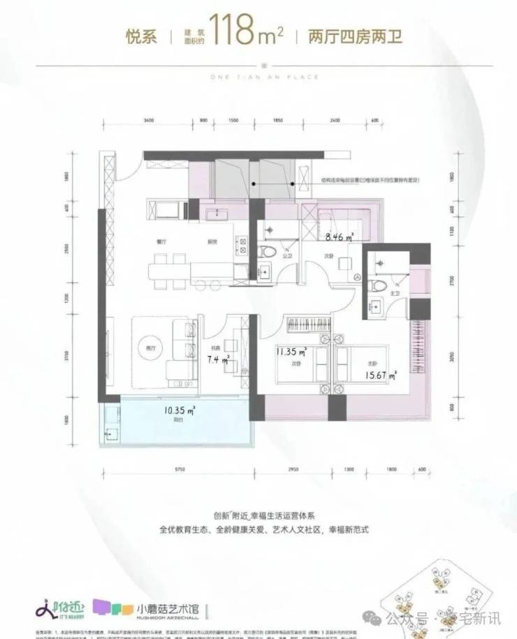 118㎡的4房2厅2卫,1栋2单元03/04户型+2栋1/2/3单元03.04.05户型,设计的是竖厅格局,进门约6.12平的入户玄关位,客厅3.5米开间,LDKB一体化设计,四开间朝南,动静分区,分别做到了主卧15.67㎡/次卧11.35㎡/次卧8.46㎡/次卧7.4㎡(包含墙体飘窗),客厅连接次卧出5.75米长的大阳台约10.35平,U型厨房,卫生间干湿分离,得房率约96.5%(包含赠送),西南或东南朝向。飘窗赠送面积14.31㎡+阳台赠送面积5.17㎡=实际赠送19.48㎡。