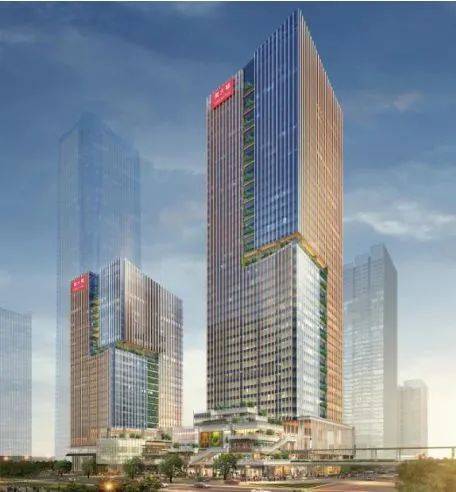 包括两座办公楼,北面为220米高的出租办公,而南面为130米高的总部办公楼。裙楼内设置了商业、艺术展览、公园、表演场地及公共配套设施,总计容面积约17万平方米。