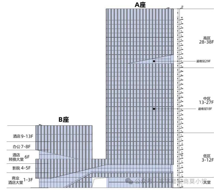 A栋写字楼:约8.4万㎡,38层的超高建筑,俯瞰全城,尽享商务高度。