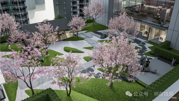 项目的景观园林面积超1万平方米,风格更是独树一帜,以“盛世翰韵”为主题,采用深圳罕有的新东方都市风格,精心打造的城市樱花大道蜿蜒于社区之间,业主们日常漫步其中,落英缤纷处,营造出自然与生活的无声对话,也是这座城市中繁华中心与静谧社区的和谐共生。