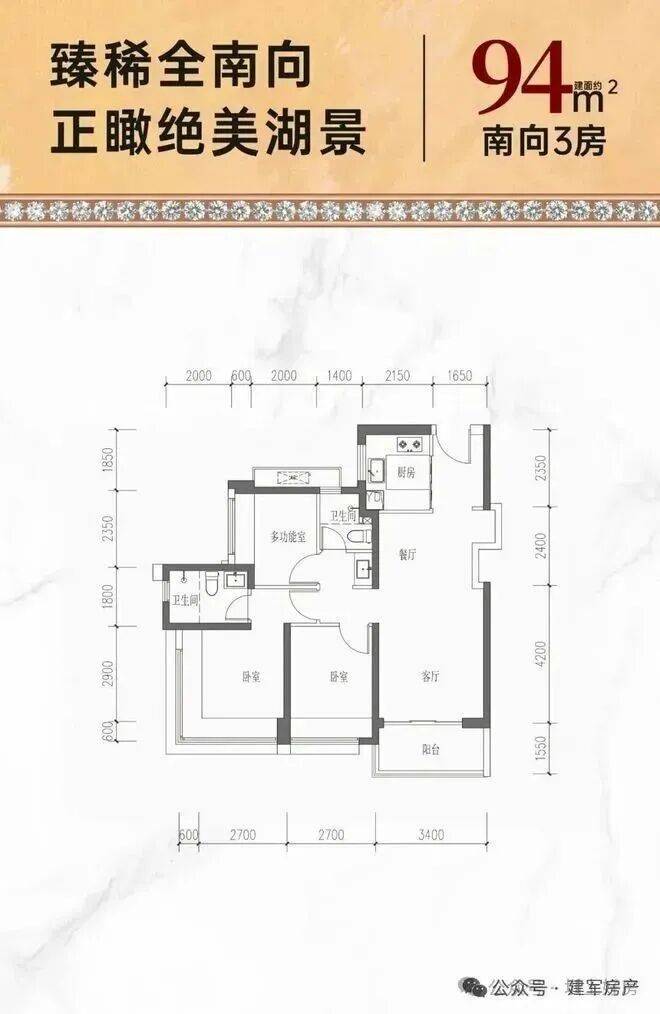 94㎡的3房2厅2卫,设计的是经典竖厅格局,客厅3.4米开间,LDKB一体化,S墙设计预留冰箱卡槽位,动静分区,三开间朝南,分别做到了主卧13.55㎡/次卧9.45㎡/次卧7.28㎡(包含墙体飘窗),U型厨房,公卫三段式干湿分离,得房率约74%(不含赠送),阳台东南朝向约5.27平。套内面积69.94㎡+赠送面积9.65㎡=实得面积79.59㎡,加上赠送后得房率约84.22%。