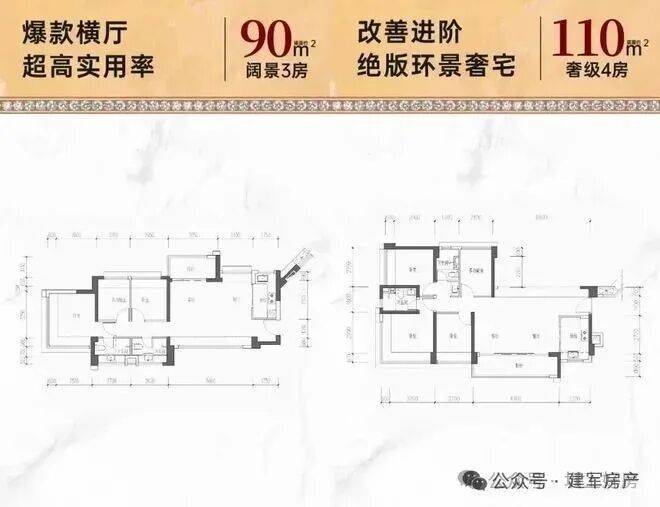 110㎡的4房2厅2卫,设计的是横厅南北通透格局,客餐厅6.1米开间,LDKB一体化设计,五开间朝南,动静分区,分别做到了主卧14.3㎡/次卧10.01㎡/次卧9.58㎡/次卧8.16㎡(包含墙体飘窗),L型厨房,公卫三段式干湿分离,得房率78.3%(不含赠送),西南朝向。套内面积86.46㎡+赠送面积19.9㎡=实得面积106.36㎡,加上赠送后得房率96.29%。