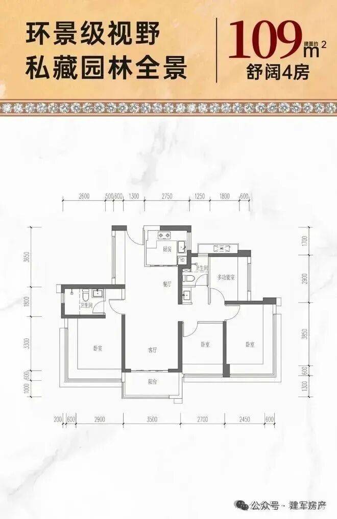 109㎡的4房2厅2卫,设计的是竖厅双龙抱珠格局,进门入户玄关,客厅3.5米开间,LDKB一体化,主卧270°无柱转角飘窗,分别做到了主卧15.45㎡/次卧13.57㎡/次卧9.31㎡/次卧6.96m²(包含墙体飘窗),U型厨房,公卫三段式干湿分离,得房率约74%(不含赠送),阳台西南朝向约5.95平。套内面积80.81㎡+赠送面积16.75㎡=实得面积97.56㎡,加上赠送后得房率约89.34%。