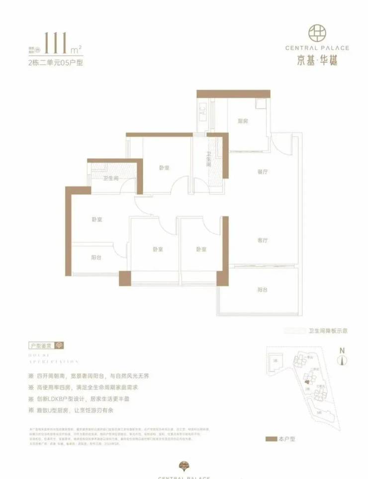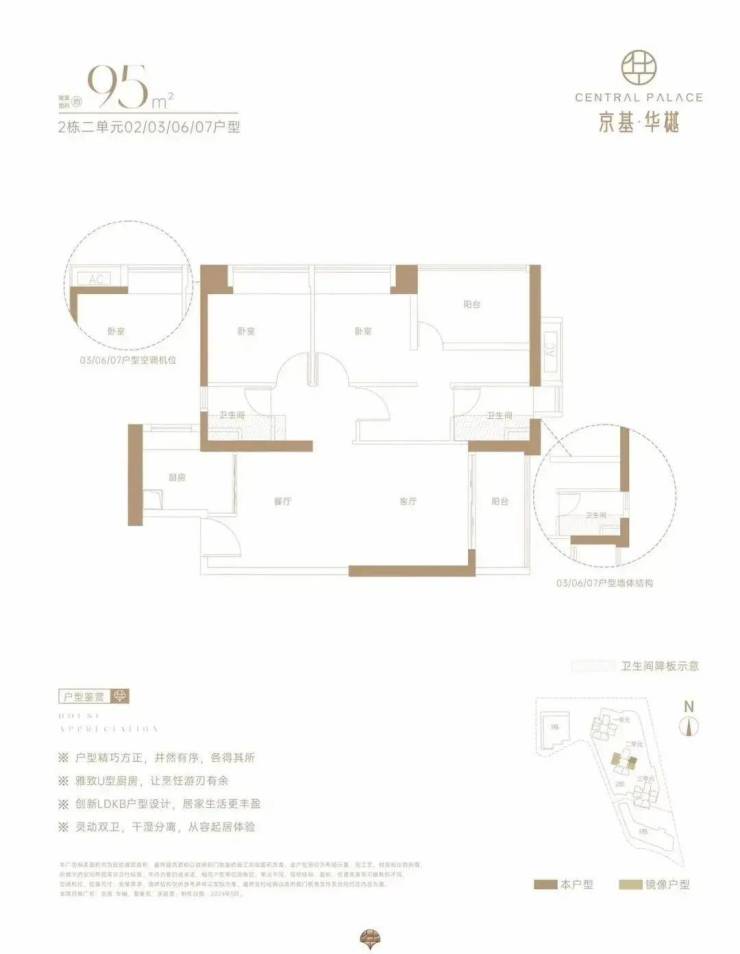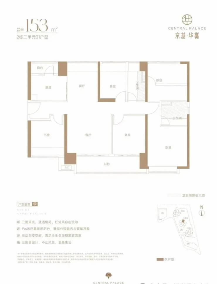 主力户型为约 95 - 153 平方米,能够兼顾不同的置业需求。如建面约 95 平的户型,虽然从布局来看仅有 2 房 2 厅 2 卫,但其可以灵活多做一个空间,实现「2 + 1 居住空间」,采用 LDKB 一体化设计,整体空间利用率高、通透性强,卫生间做了干湿分离设计。建面约 111 平的户型做了 4 房 2 厅 2 卫,LDKB 一体化设计,四开间朝南,空间更明亮且通风性更佳,U 型厨房设计。建面约 153 平的户型为竖厅设计,南北通透,具备一定的「成长性」。