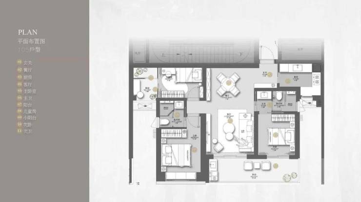 105㎡三房两卫,双阳台设计,竖厅格局,客厅与卧室连通超大阳台,看城市景观,主要朝向为西南和东南。