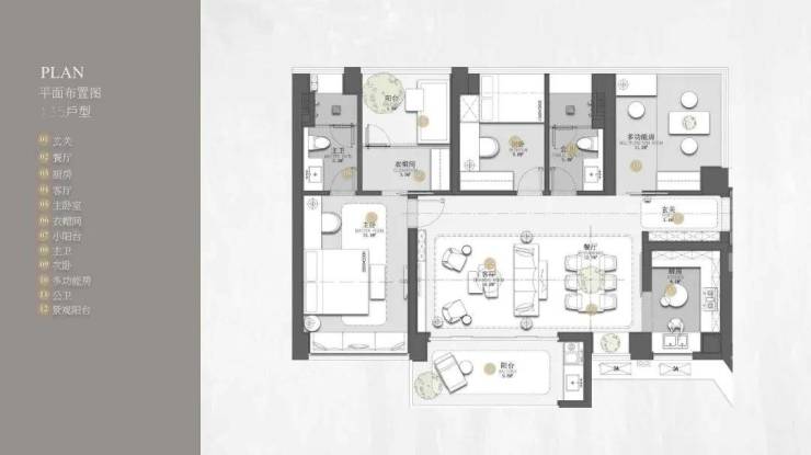 135㎡三房两卫,横厅格局,南北双阳台设计,9.8㎡南向主阳台,三个房间面积分别达到9/11/15㎡,主卧带衣帽间和卫生间,舒适度非常好。