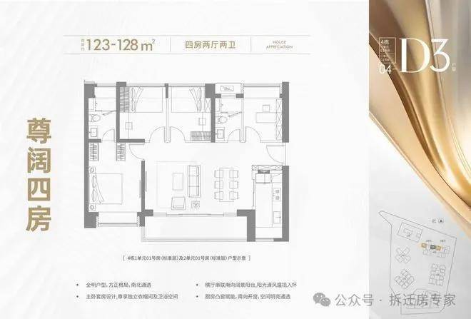 123-128㎡(四房两卫):分布在4栋1单元01和05户型,以及4栋2单元01户型;横厅设计,南北通透,户型方正;